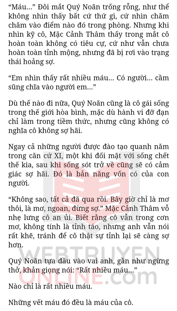 Tình trạng như thế kéo dài suốt ba đêm thì Quý Noãn mới từ từ thoát khỏi những cơn ác mộng. Lúc ngủ cô sẽ không bất chợt thức giấc bởi những cơn ác mộng kia nữa. Có lẽ mỗi lần mơ thấy chuyện đáng sợ thì bên tại lại văng vẳng giọng nói trấn an của Mặc Cảnh Thâm, thế nên cô quen thói càng ngày càng ỷ vào anh.