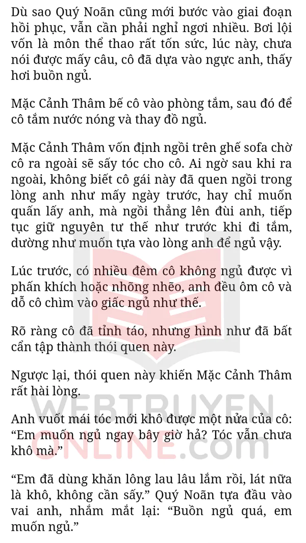 Quý Noãn đã ngủ say, Mặc Cảnh Thâm nhẹ nhàng đỡ cô nằm xuống rồi đứng dậy đi lấy máy sấy sấy tóc cô. Sau đó, đợi cô thích nghi với nhiệt độ trên đỉnh đầu thì anh mới sấy khô hết tóc, rồi nhẹ nhàng bế cô về giường ngủ.