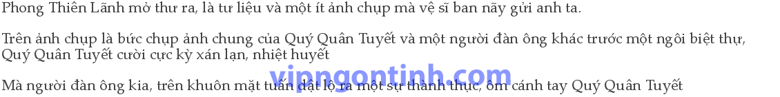 Phong Thích Minh khẩn trương nhắc nhở: “Ti úy Lãnh, tôi cảnh cáo anh, anh có biết hậu quả đắc tội boss không? Anh biết rõ chuyện mà không báo chính là phản bội.” Phong Thiên Lãnh lạnh nhạt đáp lại: “Anh ngay cả vợ boss cũng dám cướp,4chẳng phải vẫn sống tốt sao, huống chi Quân Tuyết chỉ là người yêu của bạn boss, chúng ta tuy là cấp dưới của boss, nhưng boss luôn coi chúng ta như anh em, nói không chừng boss sẽ thiên vị tôi đấy!”