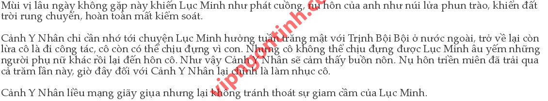 5ục Minh hung hăng, ngang ngược hôn Cảnh Y Nhân, giam cô ở trong ngực anh. Lục Minh đưa lưỡi thăm dò trong miệng cô, cạy mở hàm răng cổ, dây dưa với cái lưỡi nhỏ của cô, đảo qua từng tấc da thịt trơn mềm của cô, hận không thể vần và thân thể của cô. Anh chính là đang “muốn” có ngay ở chỗ này.